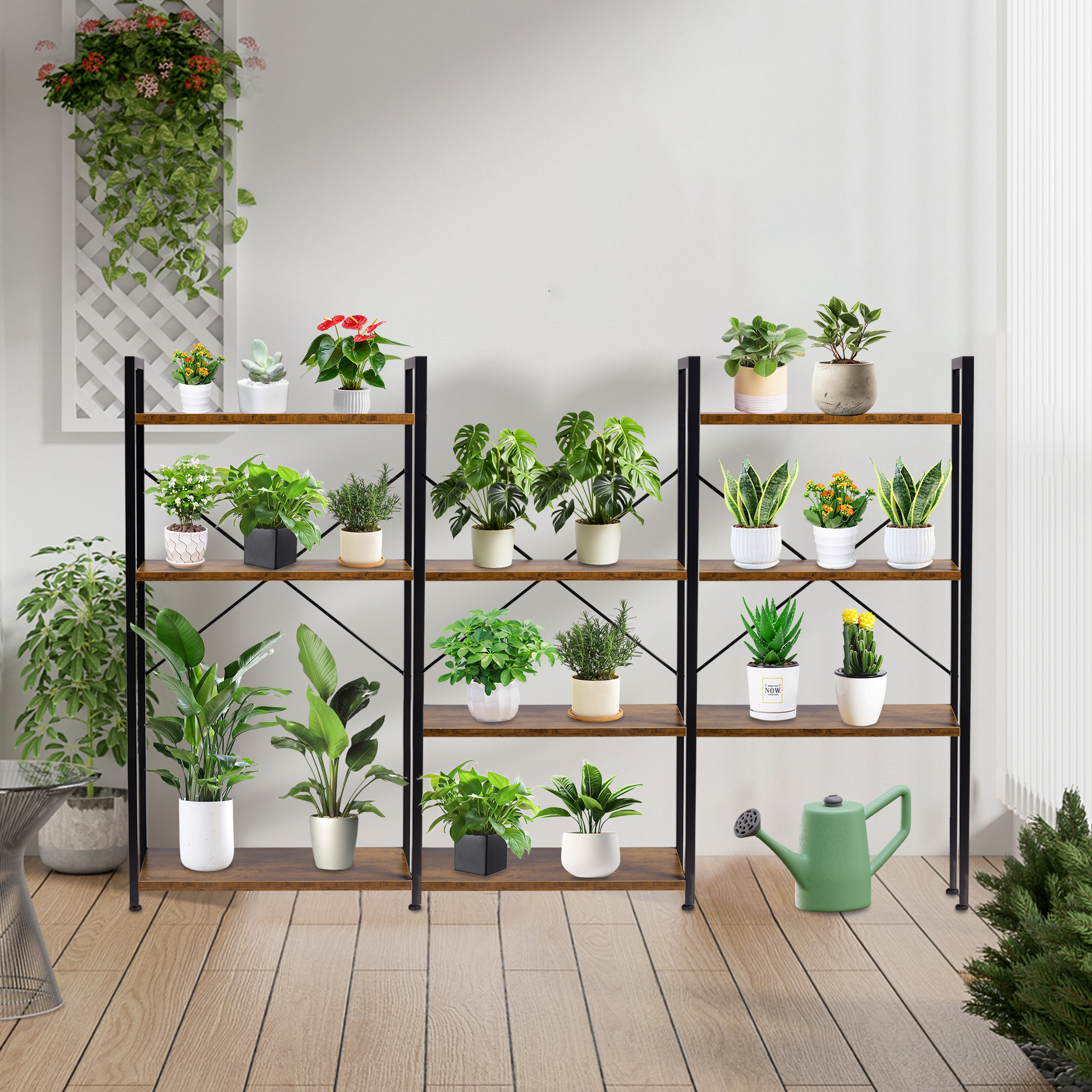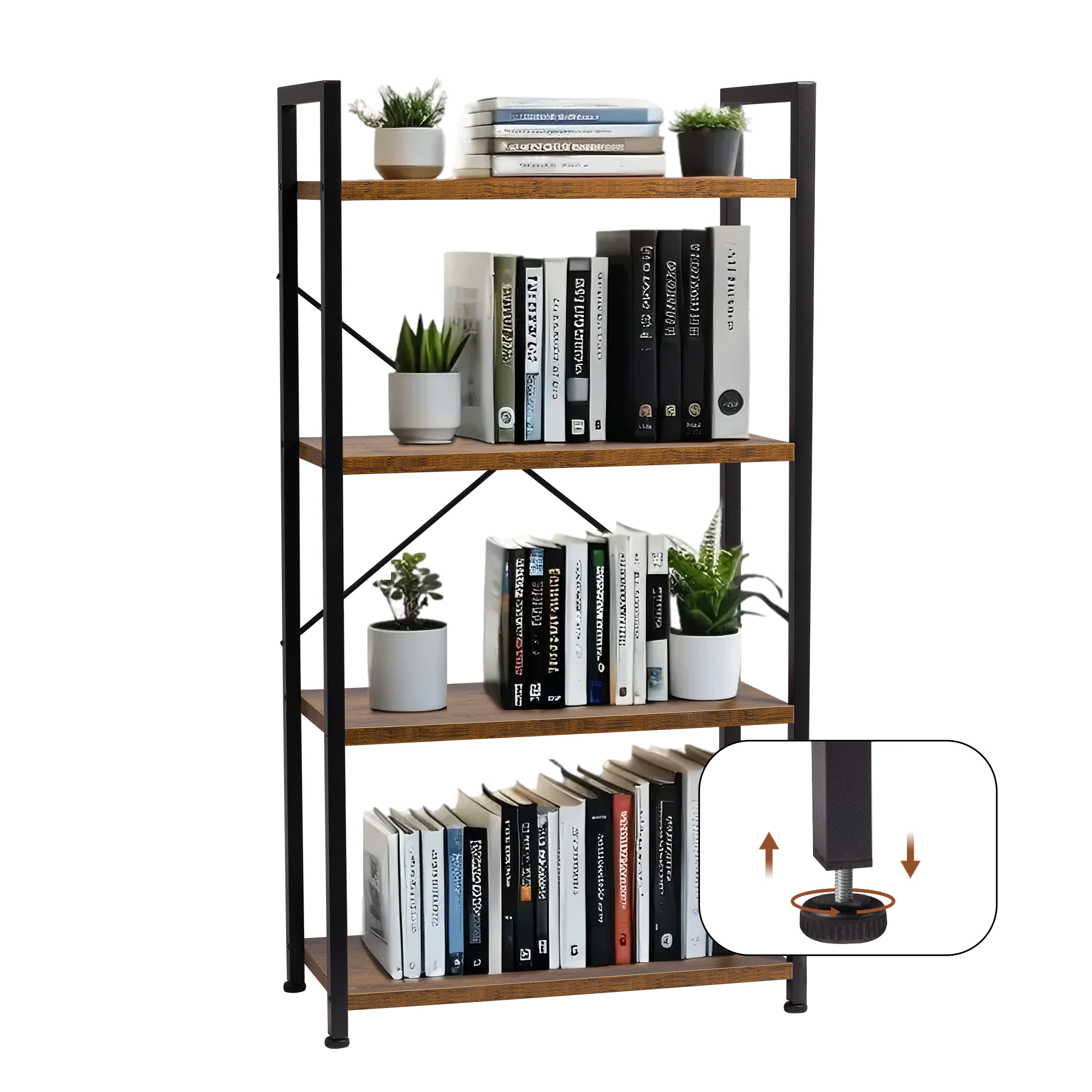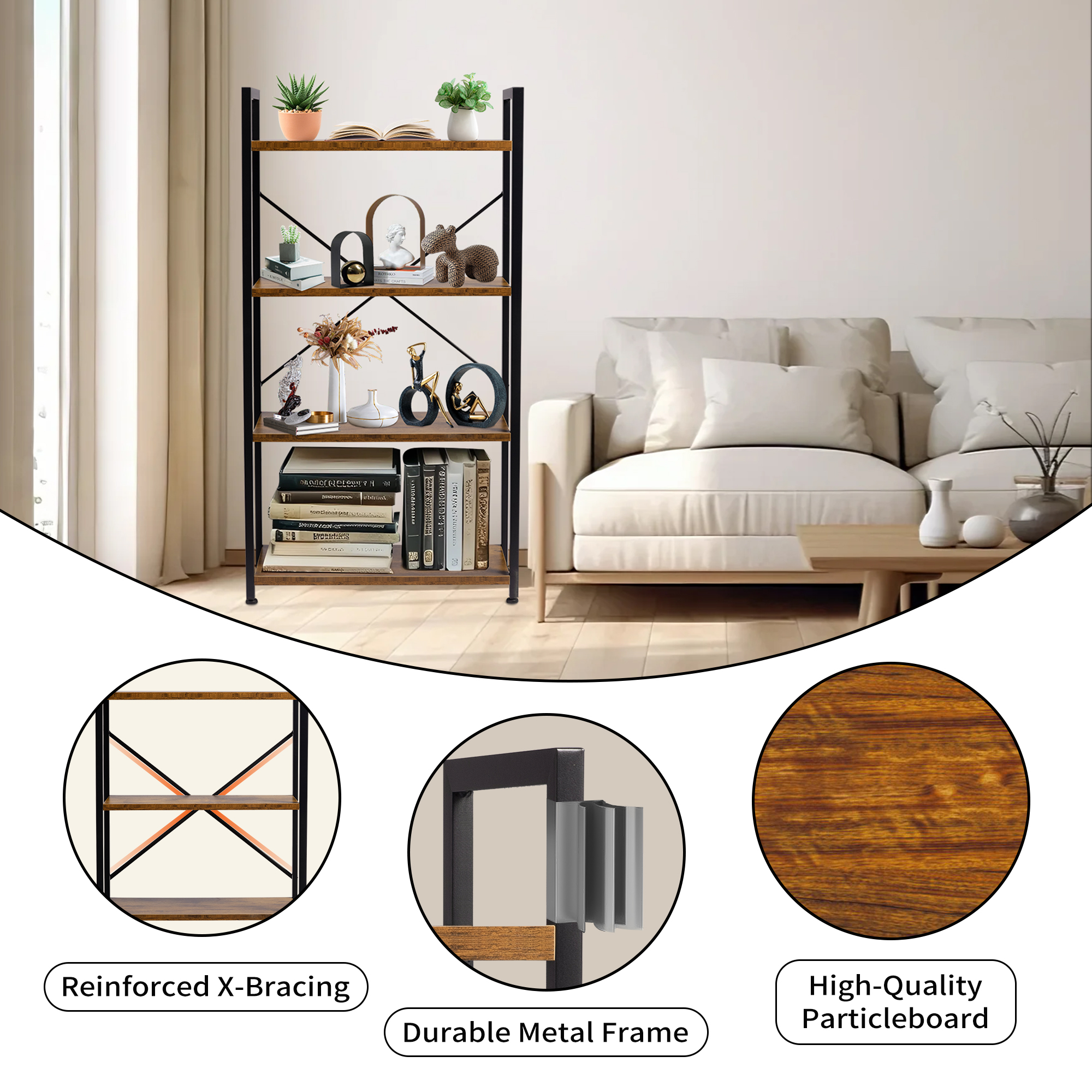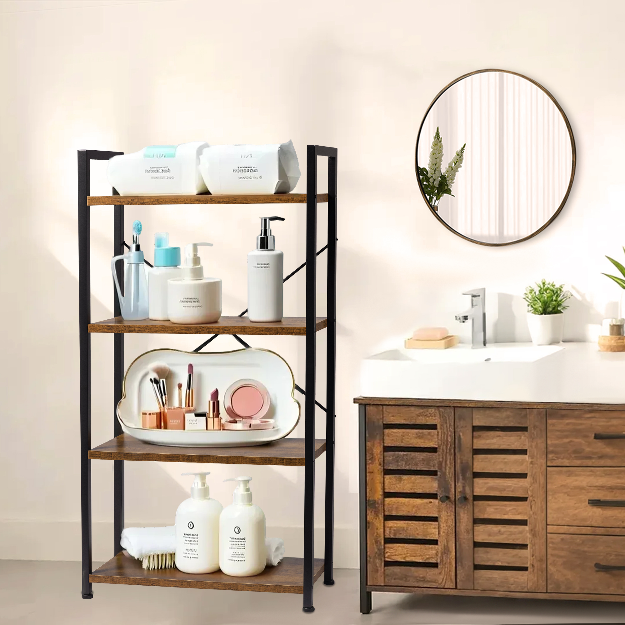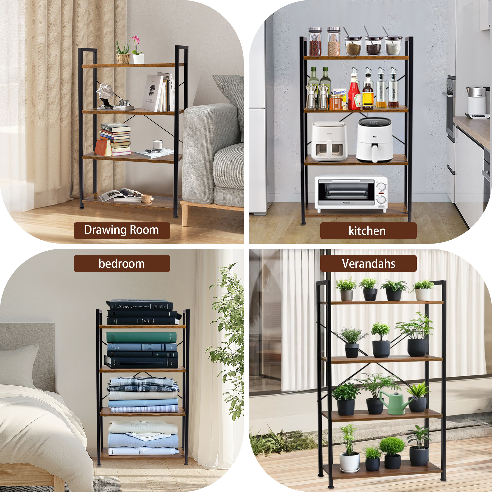 - 【Sturdy Four-Tier Storage Unit】: High-quality wood-grain particleboard and metal tubular frames ensure flat, sturdy shelves. Includes a wall-mounting system and rear X-shaped support for added stability, safely holding or displaying your essentials.