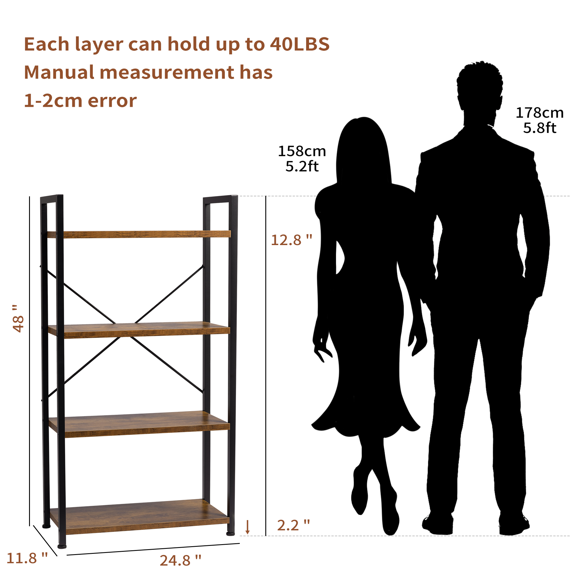 Product Features Colour: Simple Brown Material: Particleboard, Metal Product Size: 24.8 Inches Long X 11.8 Inches Wide X 48 Inches High (122 Centimeters) Product Weight: 22 Pounds (10 Kilograms) The Maximum Static Load Capacity of Each Shelf: 40 Pounds (18 Kilograms) Maintenance Methods: Wipe Clean