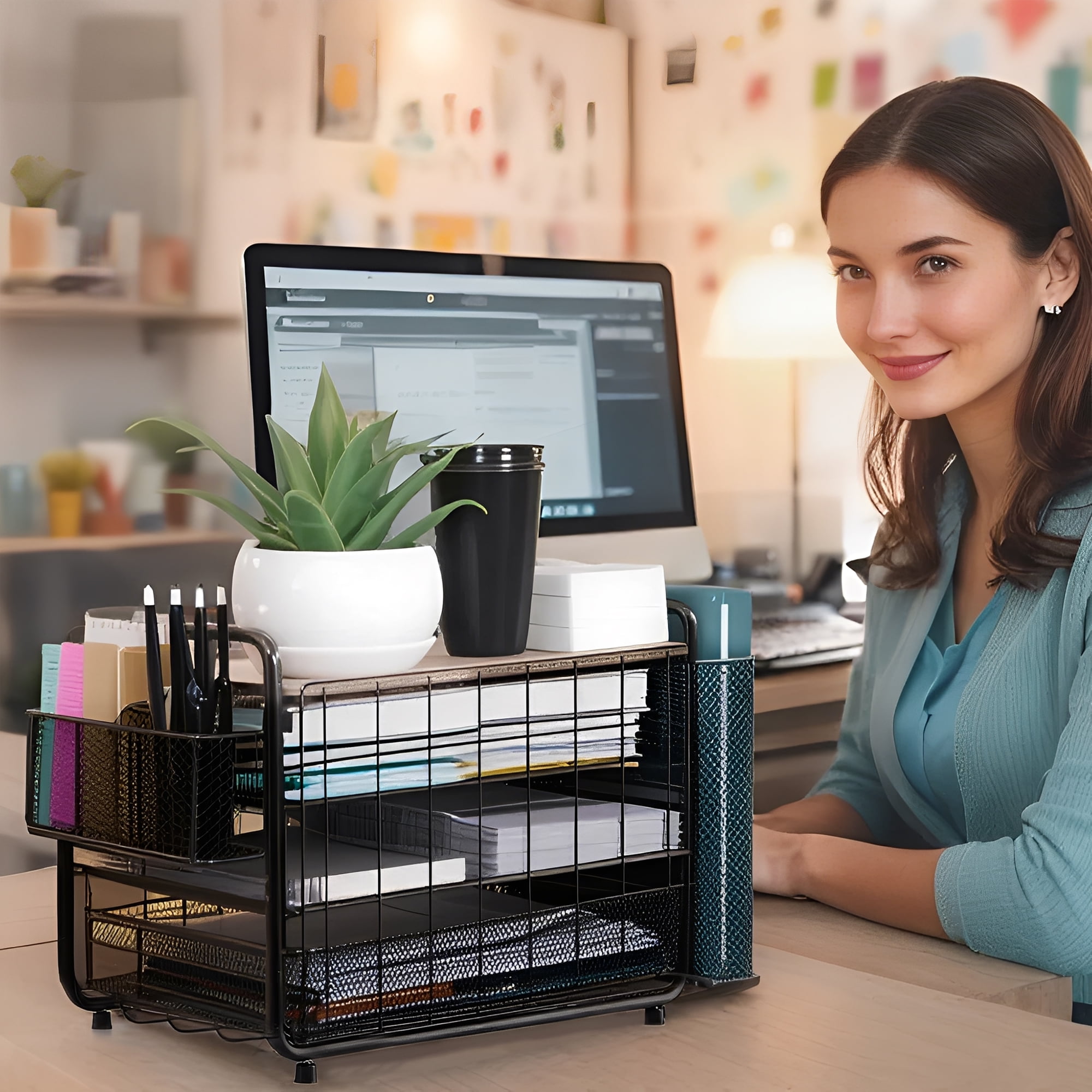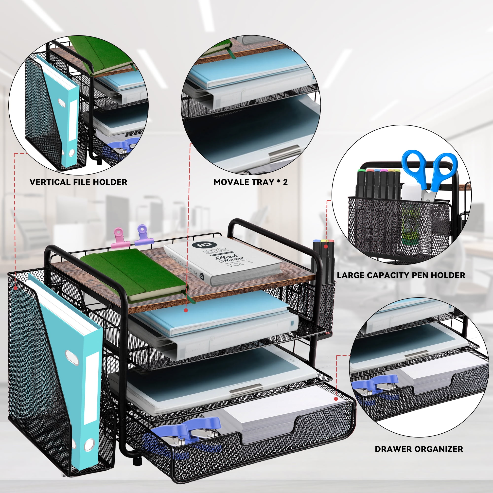 - 【 Four-Layer Scientific Zoning 】 The Desk Organizer Office Accessories Includes 2 Sliding Trays +1 File Rack +1 Pen Holder +1 Sliding Drawer, Making It Easy to Categorize and Store Stationery, Files, And Small Items, Keeping the Desktop Neat and Clear at a Glance.