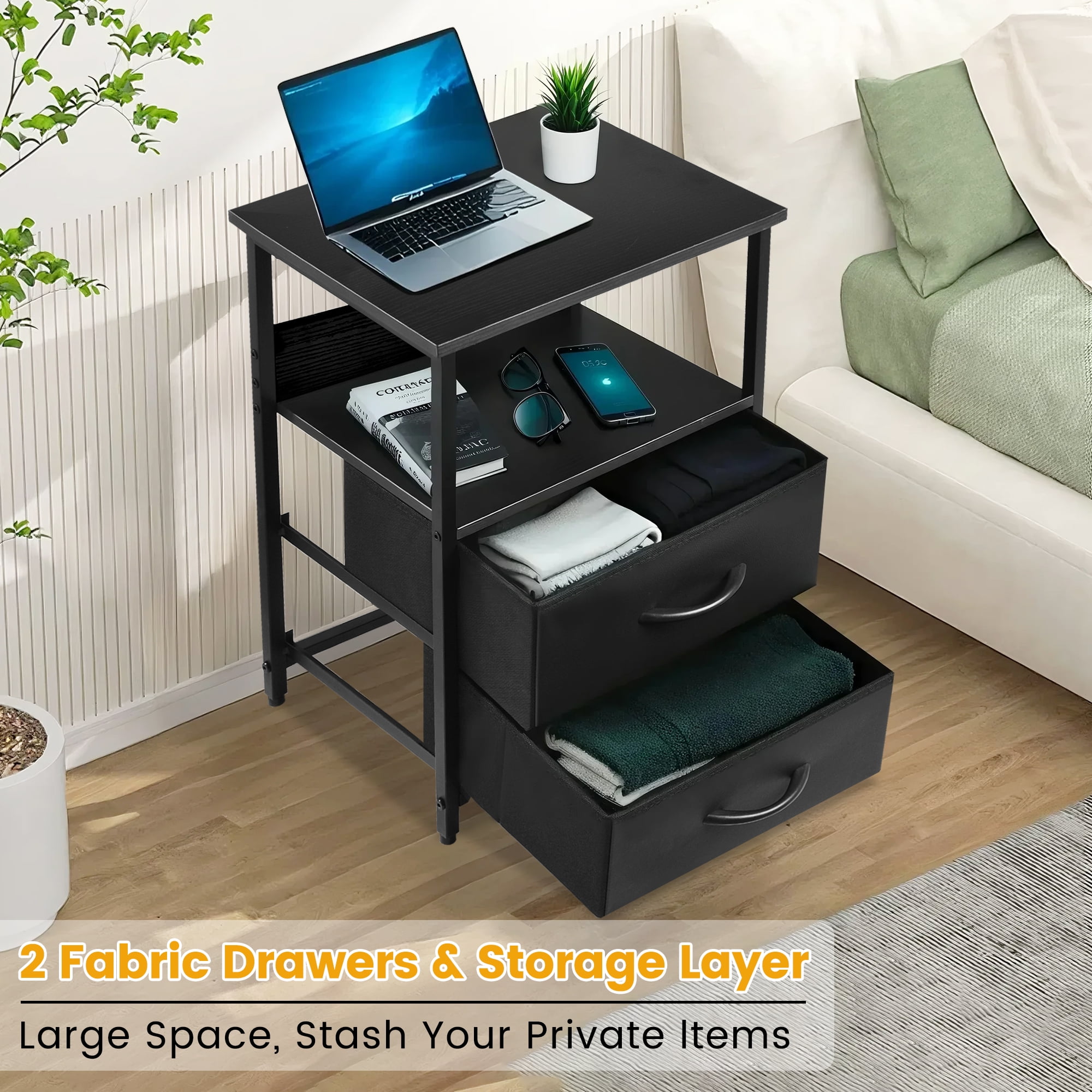 This Sleek YEEZEE Black Nightstand Combines Style and Functionality to Enhance the Organization of Your Bedroom. The Bedside Tables Features 2 Spacious Fabric Drawers with Reinforced Handles for Smooth Access, And Upper and Lower Wood Shelves for Additional Open Storage. The Smooth Tabletop for Easy Cleaning, While the Sturdy Metal Frame Ensures Long-Lasting Durability. 4 Adjustable Feet Stabilize and Prevent Scratches on Any Floor, And the Added Back Panel Prevents Items from Falling. Is Perfect as a Bedroom Nightstand, End Tables for Bedroom, Or Small Storage Solution for a Living Room End Tables or Side Tables for Bedroom. Age Group: Adult, Child, Teen.