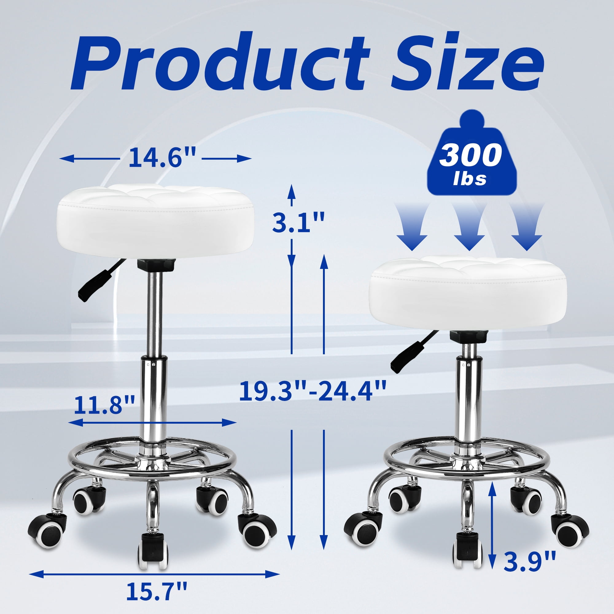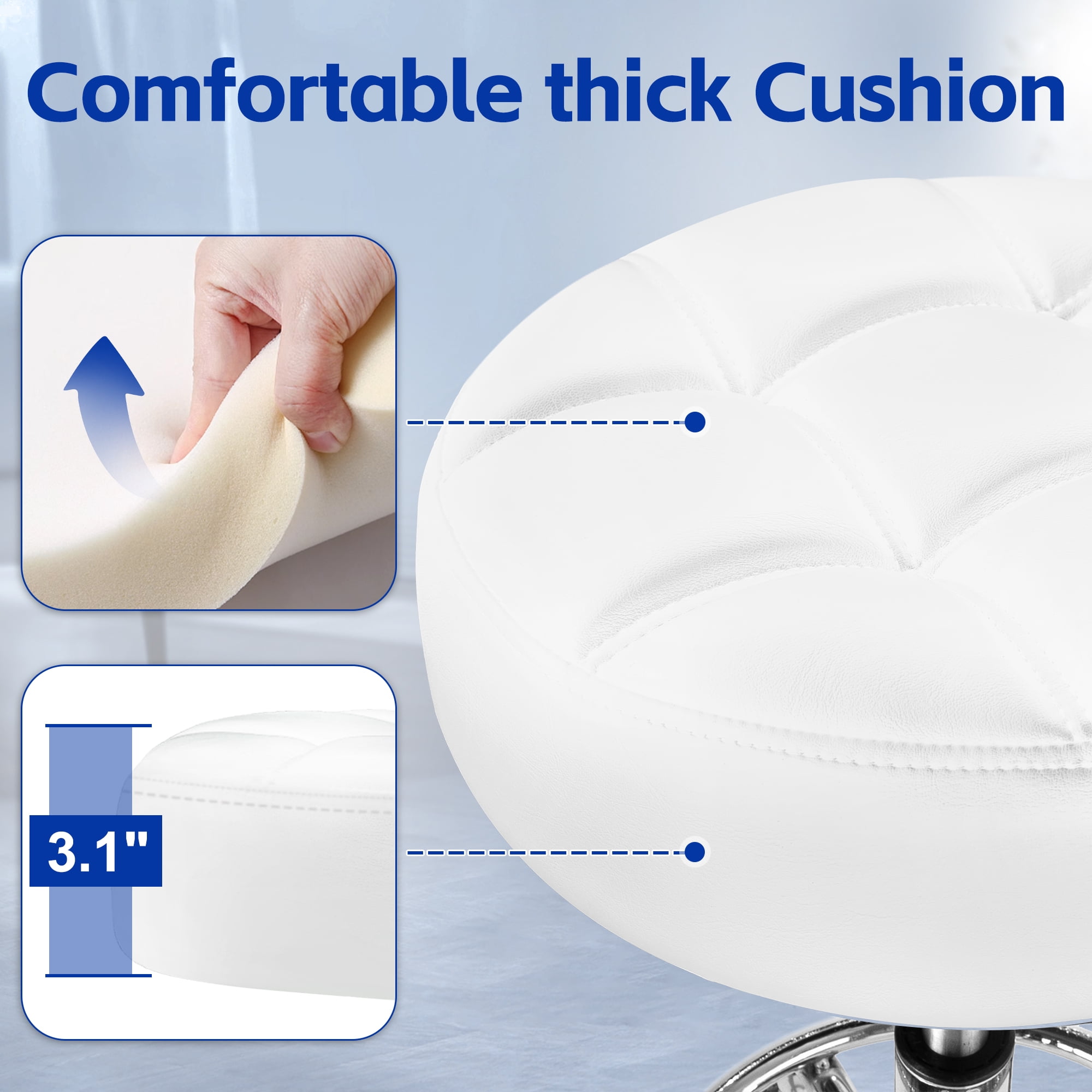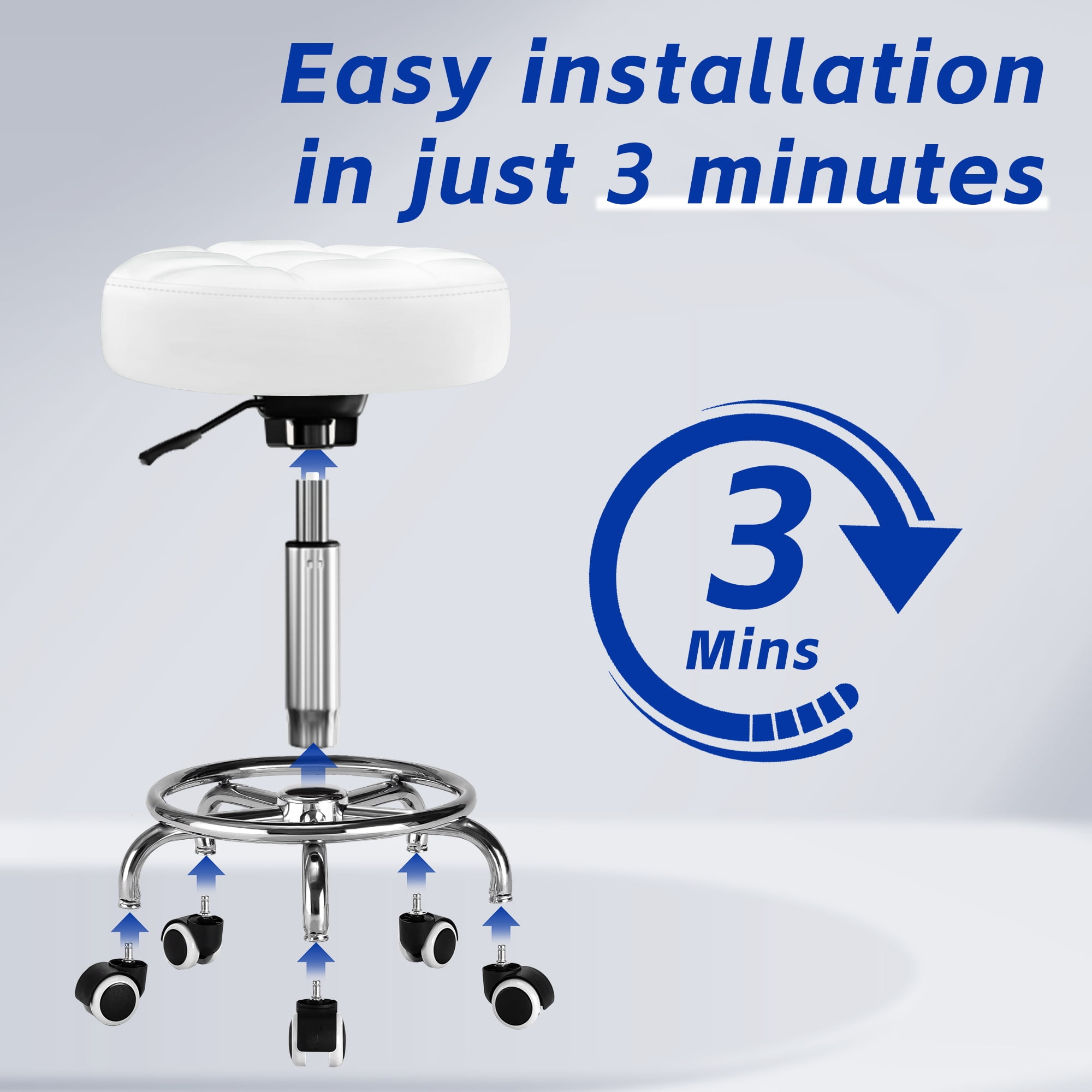 - ✅【Extra-Comfy Seat】Upgraded Comfort, No Fatigue After Sitting For A Long Time"14.6" Wide, 3.1" Thick High-Density Foam—Soft But Supportive, No Sagging. Rolls Smoothly For All-Day Comfort!"✅【Versatile Use】From Office To Home, One Stool Fits All"Not Just An Office Chair! Use It As A Kitchen Bar Stool, Salon Stool, Or Spa Chair. The Sturdy Base And Smooth-Rolling Wheels Move With You Anywhere."✅【Adjustable Height + Footrest】Customize For Your Body"No More Straining! Elevate The Seat (19.3-24.4 Inches) And Step On The Footrest To Support You At Your Most Comfortable Height-All In Comfort All Day Long."✅【Sturdy & Quiet Wheels】Glide Freely Without Noise"360° Silent Casters Won't Scratch Floors Or Disturb Others. Stable And Smooth - Ideal For Hard Floors Or Carpets!"✅【Easy To Assemble】Ready In Minutes, No Hassle"Out Of The Box, Plug In The Casters, Install The Air Bar, Attach The Cushion And Start Rolling! Tools Are Included And Instructions Are Clear - Roller Stool Installation In 3 Minutes.”