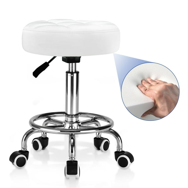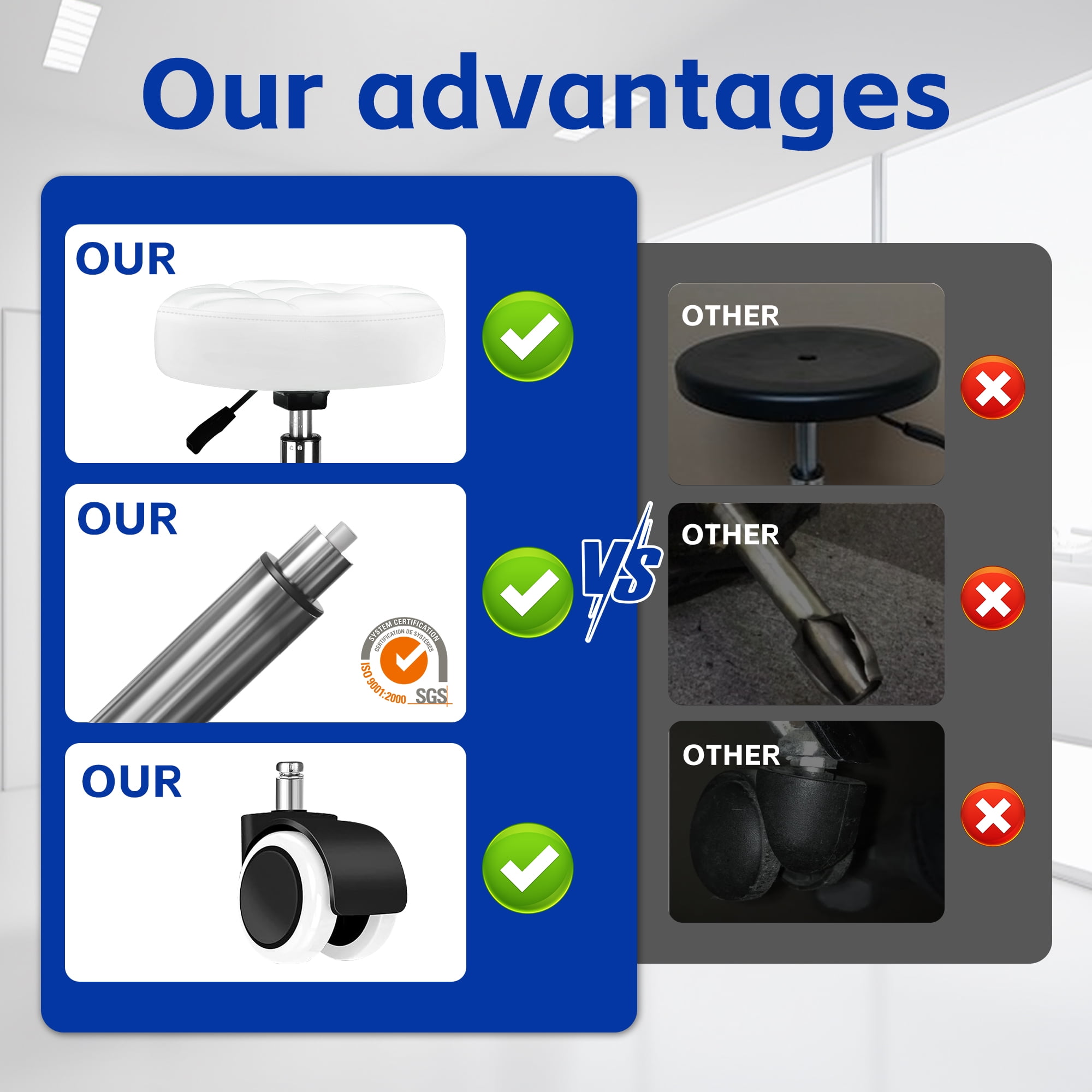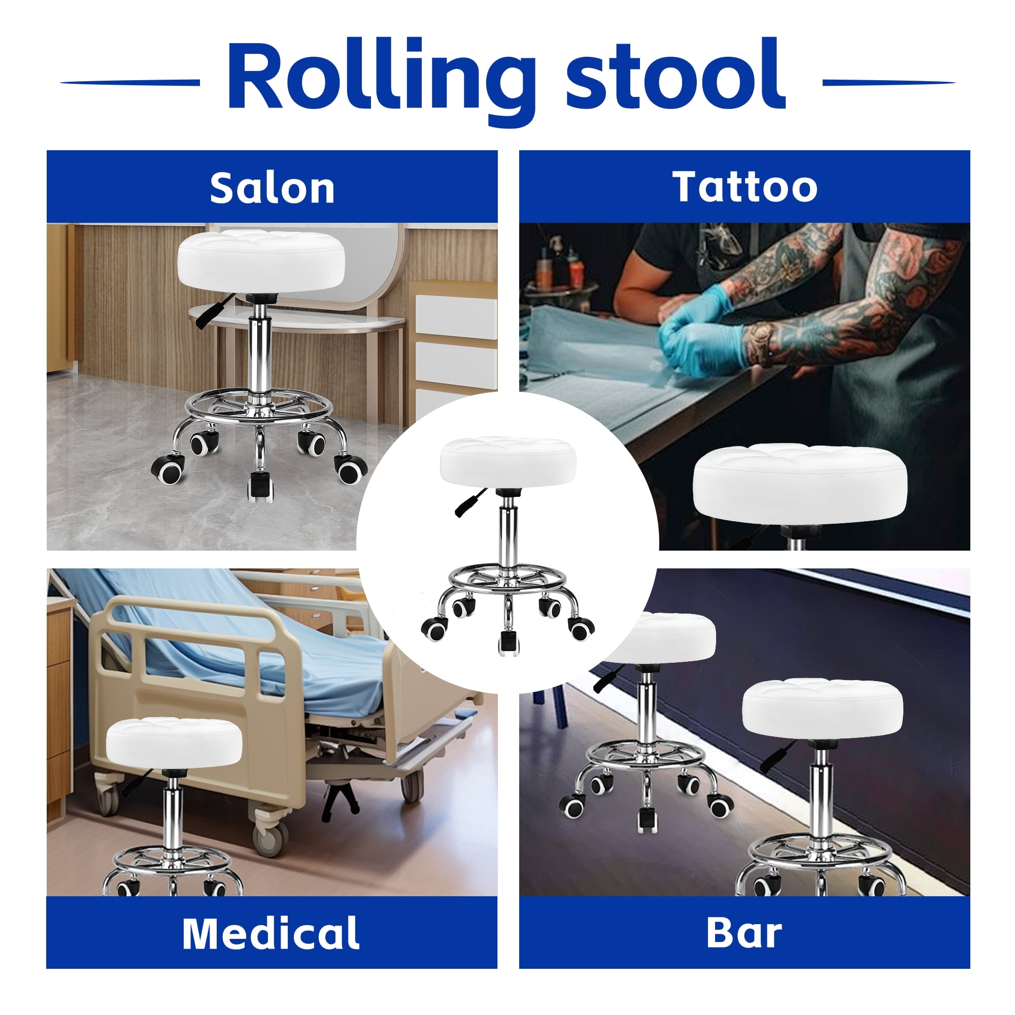- ✅【Extra-Comfy Seat】Upgraded Comfort, No Fatigue After Sitting For A Long Time"14.6" Wide, 3.1" Thick High-Density Foam—Soft But Supportive, No Sagging. Rolls Smoothly For All-Day Comfort!"✅【Versatile Use】From Office To Home, One Stool Fits All"Not Just An Office Chair! Use It As A Kitchen Bar Stool, Salon Stool, Or Spa Chair. The Sturdy Base And Smooth-Rolling Wheels Move With You Anywhere."✅【Adjustable Height + Footrest】Customize For Your Body"No More Straining! Elevate The Seat (19.3-24.4 Inches) And Step On The Footrest To Support You At Your Most Comfortable Height-All In Comfort All Day Long."✅【Sturdy & Quiet Wheels】Glide Freely Without Noise"360° Silent Casters Won't Scratch Floors Or Disturb Others. Stable And Smooth - Ideal For Hard Floors Or Carpets!"✅【Easy To Assemble】Ready In Minutes, No Hassle"Out Of The Box, Plug In The Casters, Install The Air Bar, Attach The Cushion And Start Rolling! Tools Are Included And Instructions Are Clear - Roller Stool Installation In 3 Minutes.”
