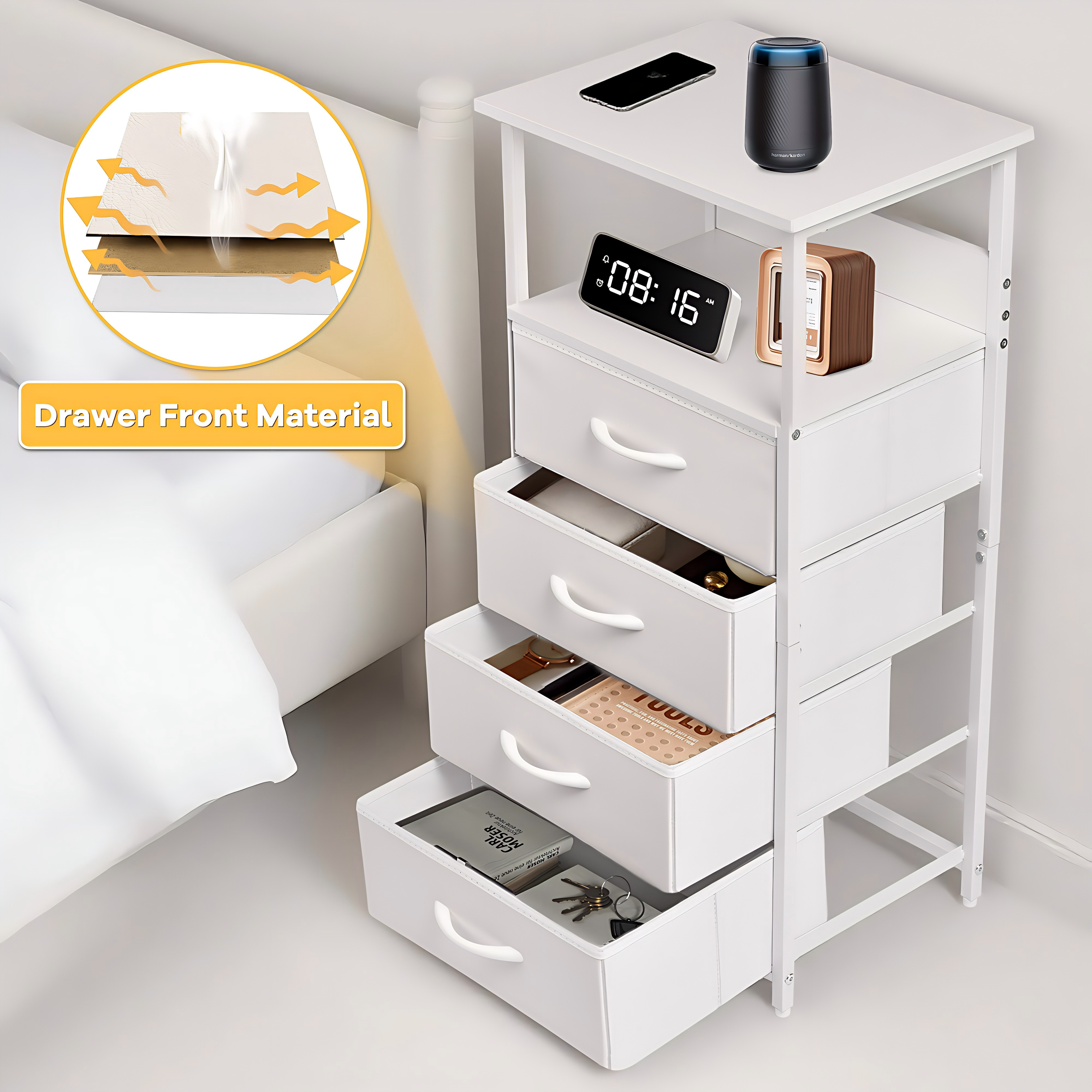 - 【Space-Saving Solution】11" slim profile fits perfectly in tight corners (bedside, sofa, window seat), saving ≥30% floor space. Versatile use as nightstand, side table, or organizer.