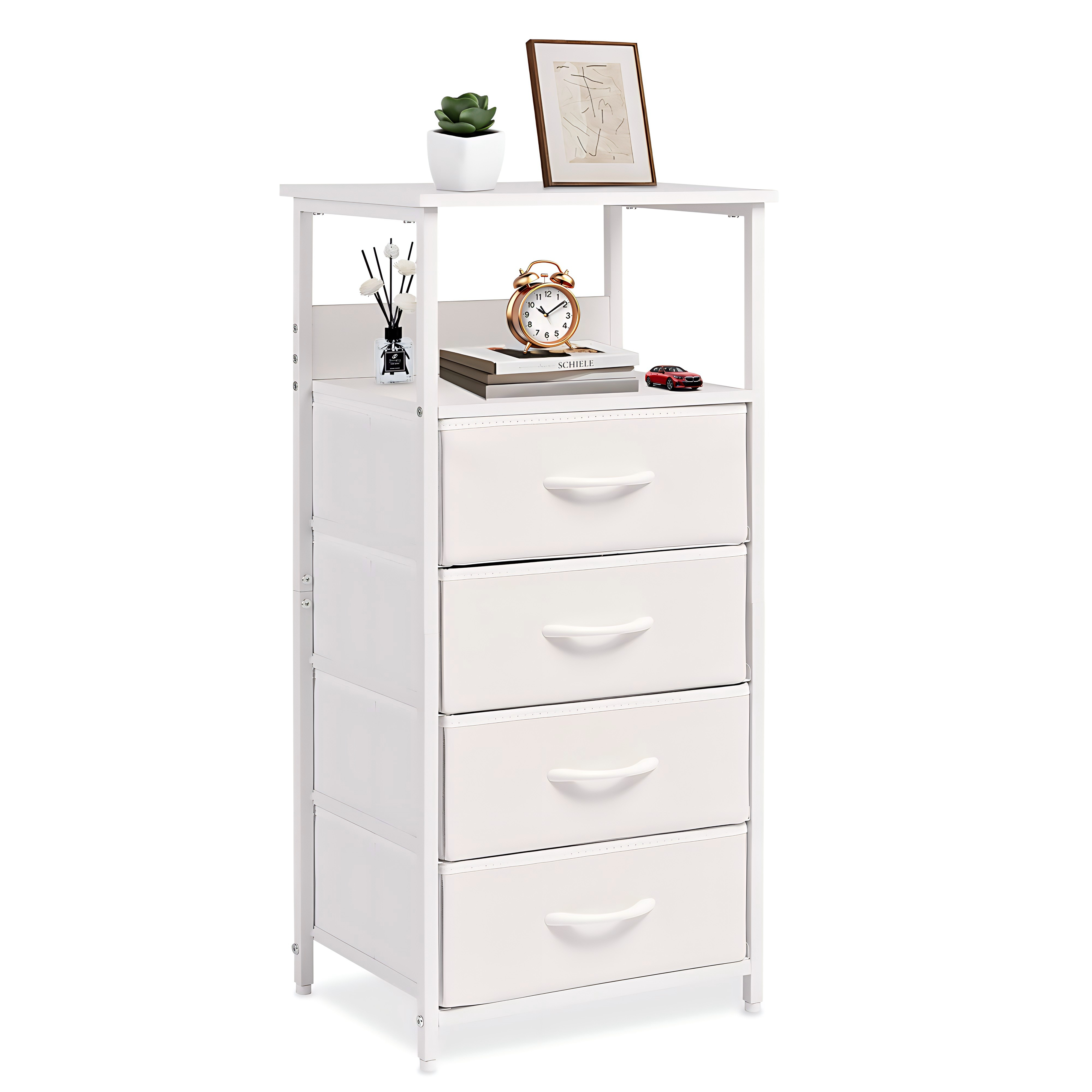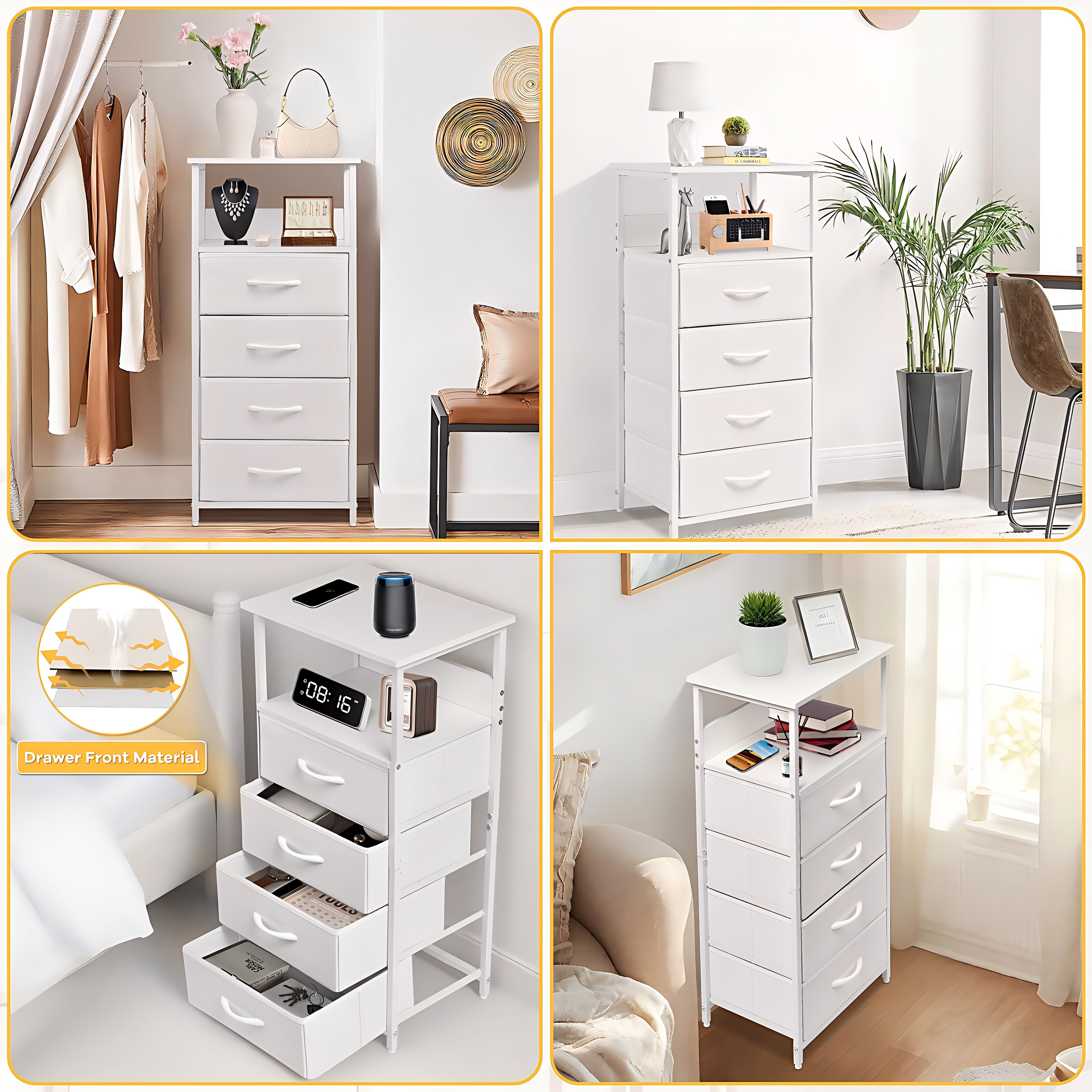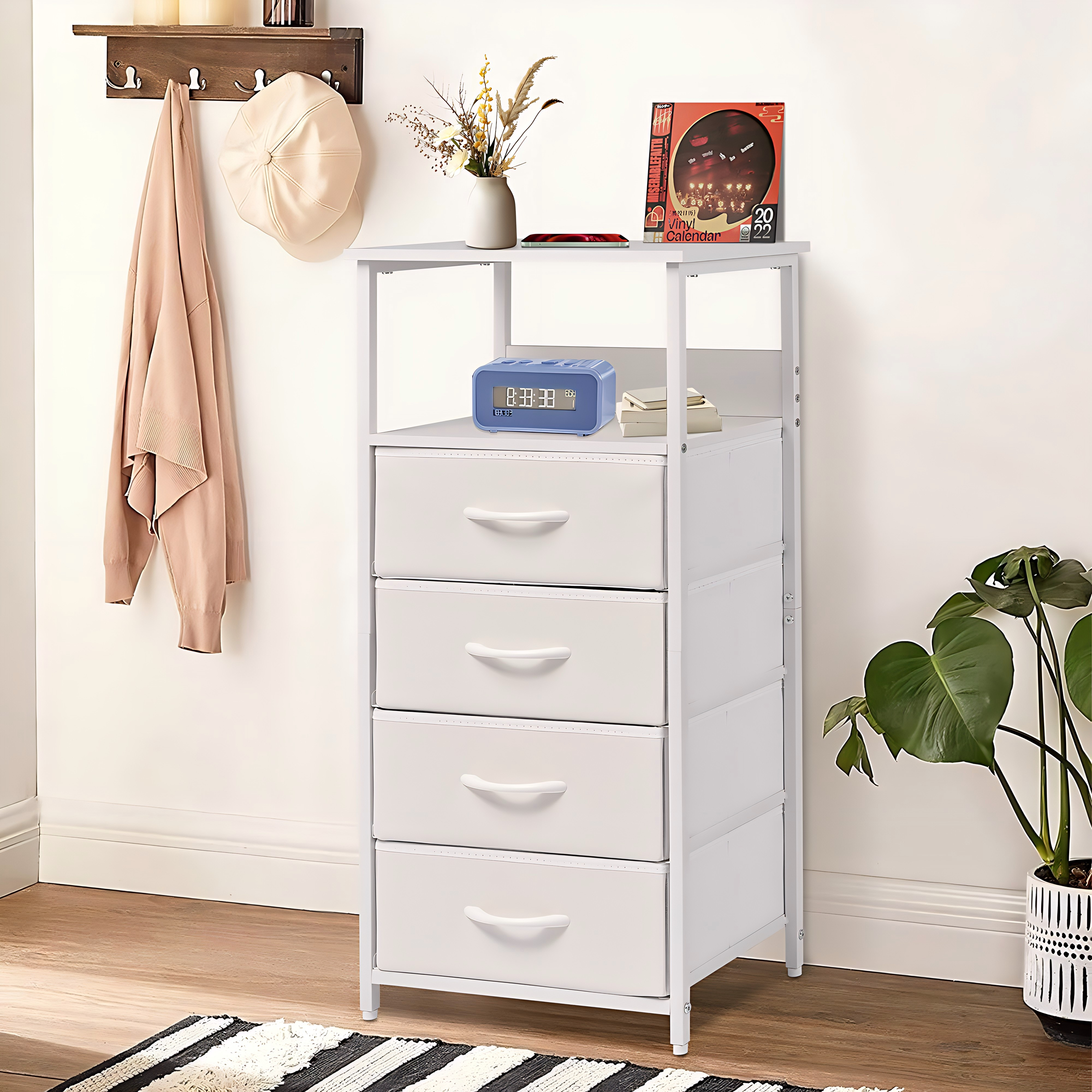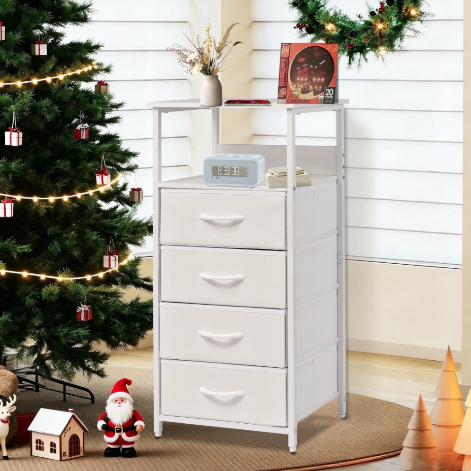 This compact white dresser with 4 foldable fabric drawers and open display shelves is designed to maximize space in tight corners. Its sturdy steel frame and adjustable feet ensure stability, while the slim 11-inch width fits seamlessly beside beds, sofas, or in kids’ rooms. Easy to assemble in 15 minutes, it’s a versatile storage solution for organizing essentials and enhancing any modern, rustic, or industrial decor.