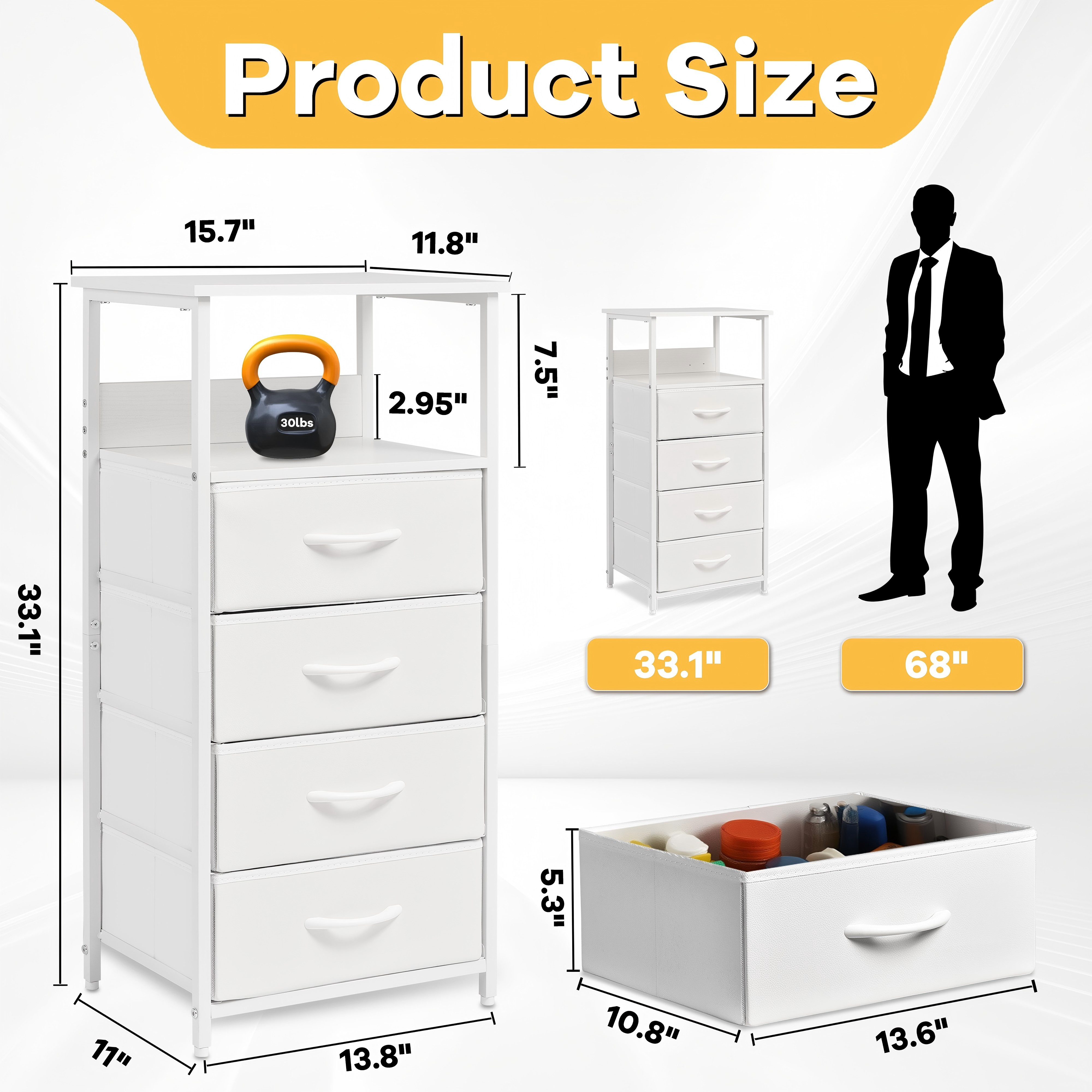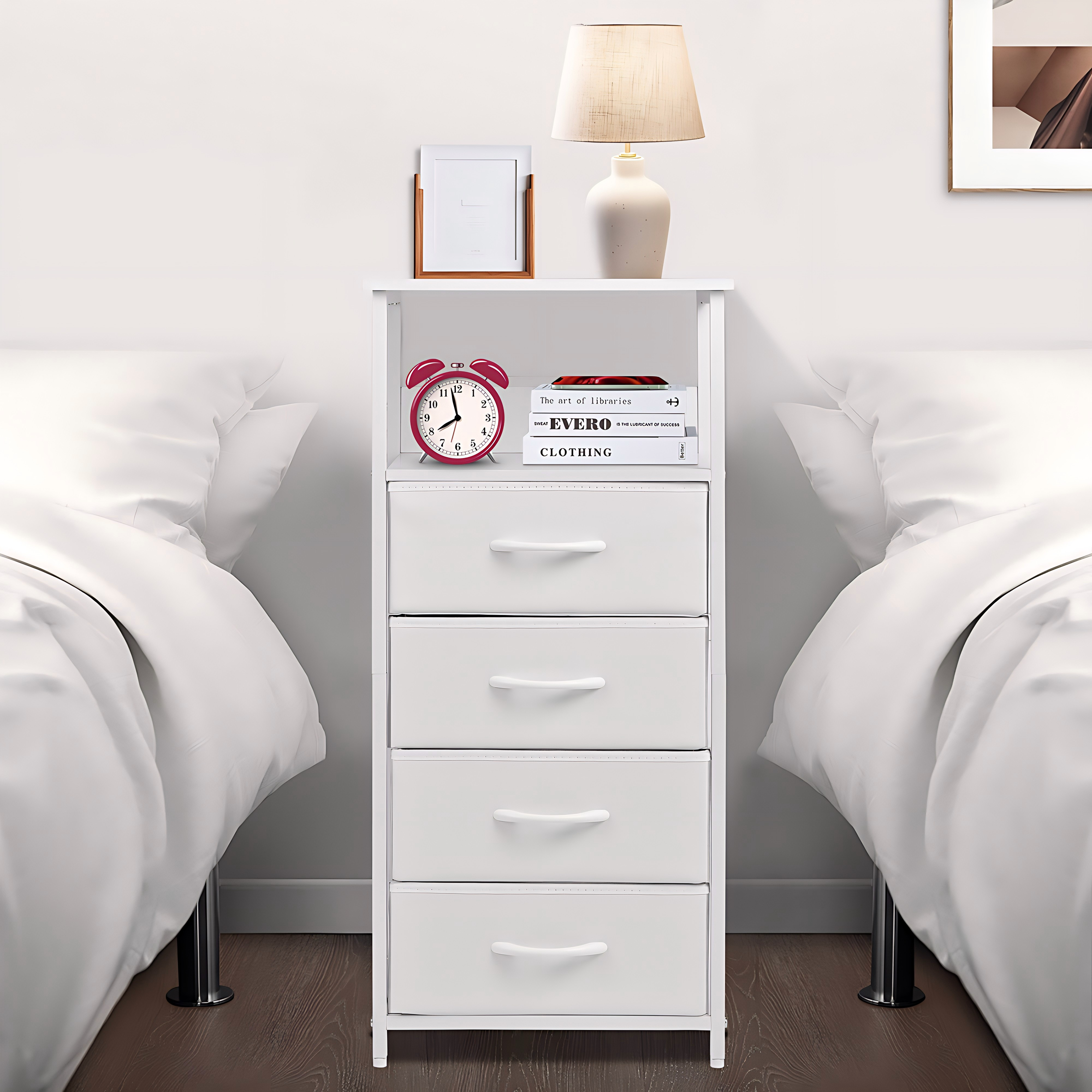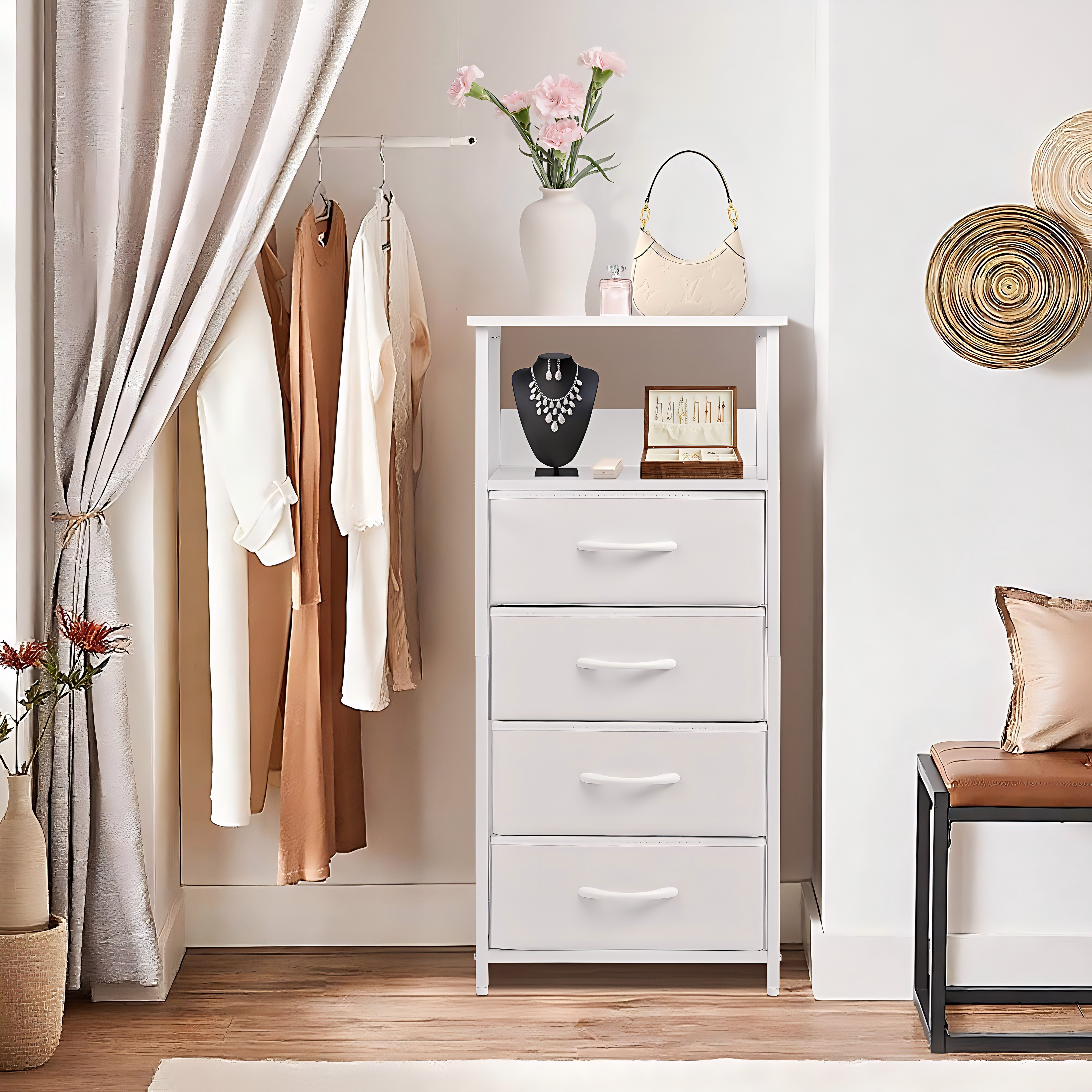 This compact white dresser with 4 foldable fabric drawers and open display shelves is designed to maximize space in tight corners. Its sturdy steel frame and adjustable feet ensure stability, while the slim 11-inch width fits seamlessly beside beds, sofas, or in kids’ rooms. Easy to assemble in 15 minutes, it’s a versatile storage solution for organizing essentials and enhancing any modern, rustic, or industrial decor.