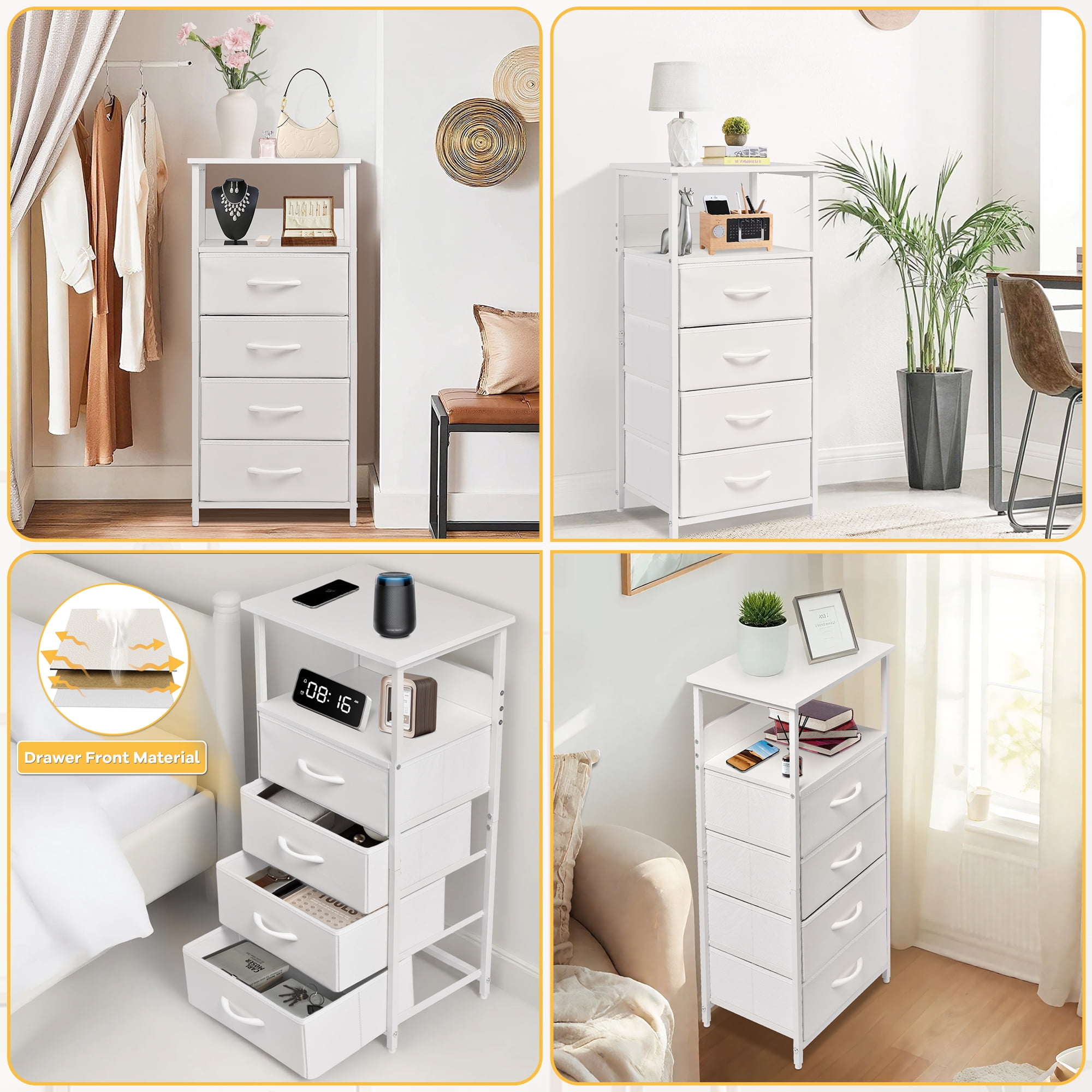 YEEZEE White Nightstand - Reshaping Bedroom Order with Exquisite Storage. This Multi-functional Night Table Is Equipped with 4 Large-Capacity Fabric Drawers and Double-Layer Open Wooden Shelves, Making It Easy to Store Books, Clothes, Children's Toys and Daily Necessities in an Orderly and Classified Manner. The Metal Frame with Night Stand with Drawers, Paired with Adjustable Legs, Is Stable and Adaptable to Various Floors Such as Carpets and Wooden Floors. Additional Back Panel Design Reduces the Risk of Accidental Slipping of Items on the Shelf Edges. The Nightstands Does Not Require Complicated Installation and Can Be Quickly Assembled Within 15 Minutes. It Can Be Placed Beside the Bed to Display a Desk Lamp or Photo Frame to Create a Warm Bedroom, Moved to the Entrance Hall to Serve as a Key Storage Station, Or Placed in the Children's Room to Organize Picture Books and Toys. The YEEZEE Bedside Table Features a Durable Metal Structure and Fabric Drawers, Paired with a Matte White and Simple Appearance, Perfectly Blending into Modern, Nordic and Country Style Home Furnishings.