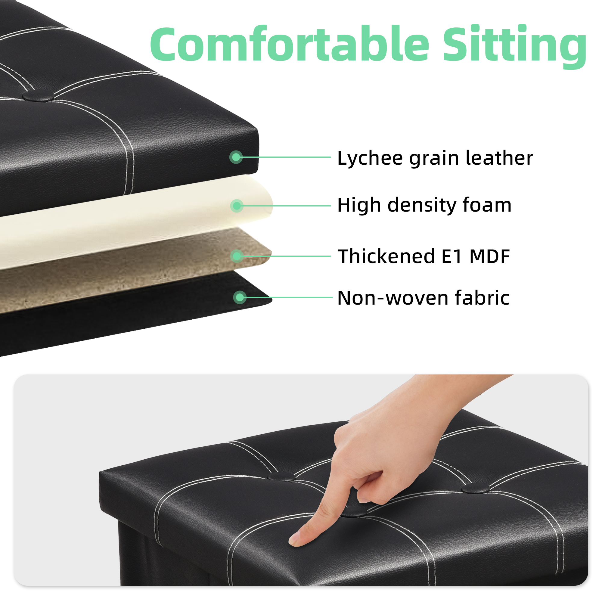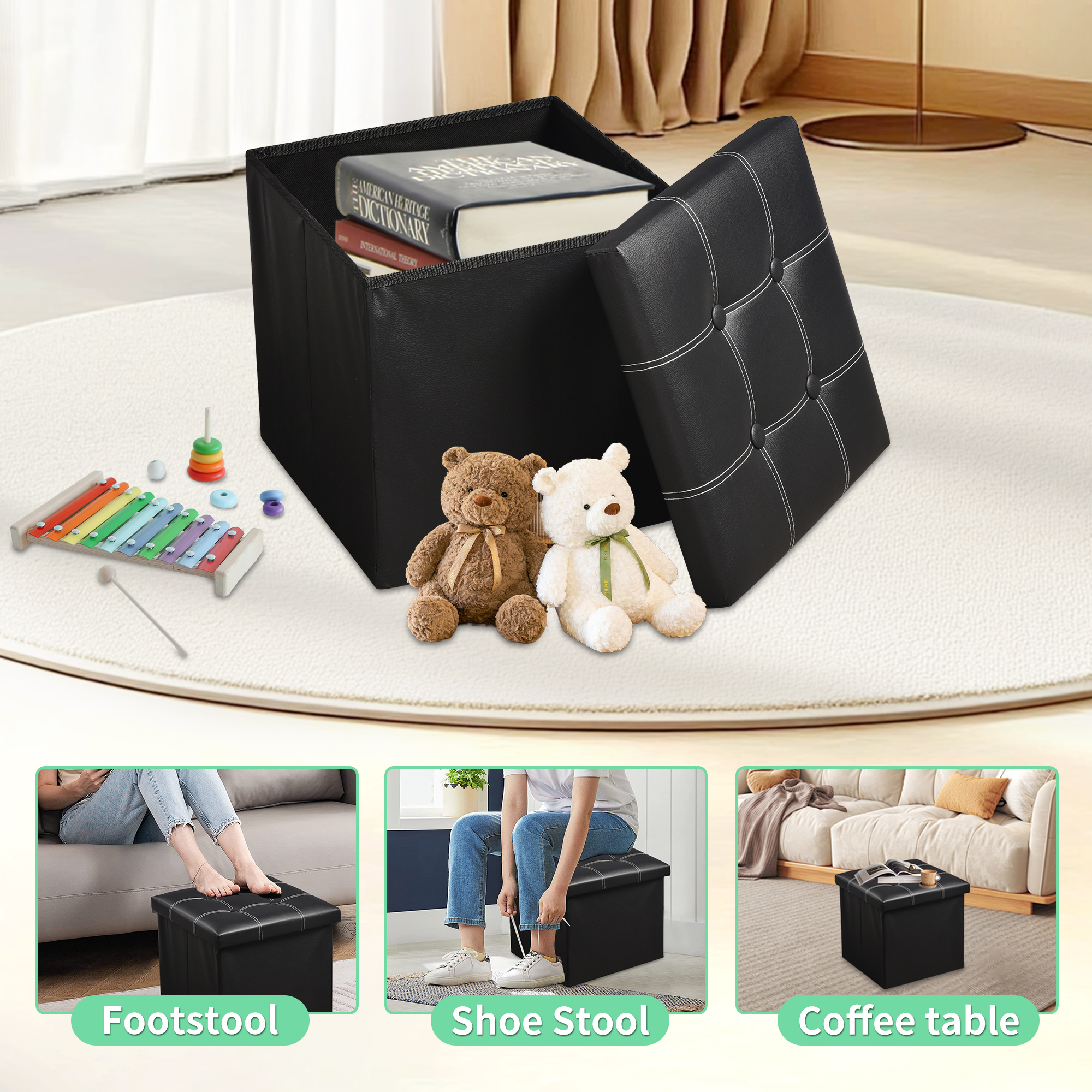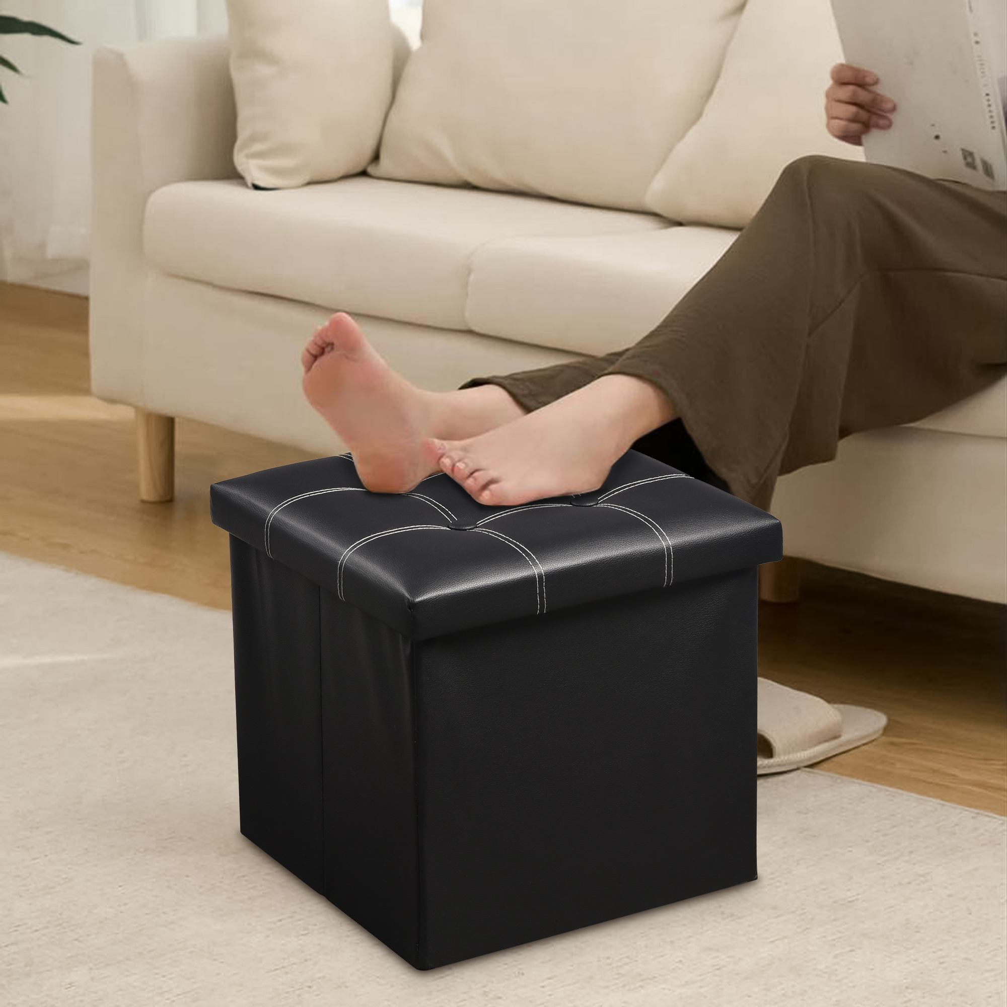 I bought the "15" black faux leather" one for about $13 including tax and I was pleasantly surprised to see the quality of this item! I like that the top is tufted, and that makes it look expensive. The padding on the top makes it comfortable to sit on, or to rest your feet on, when used as an ottoman.